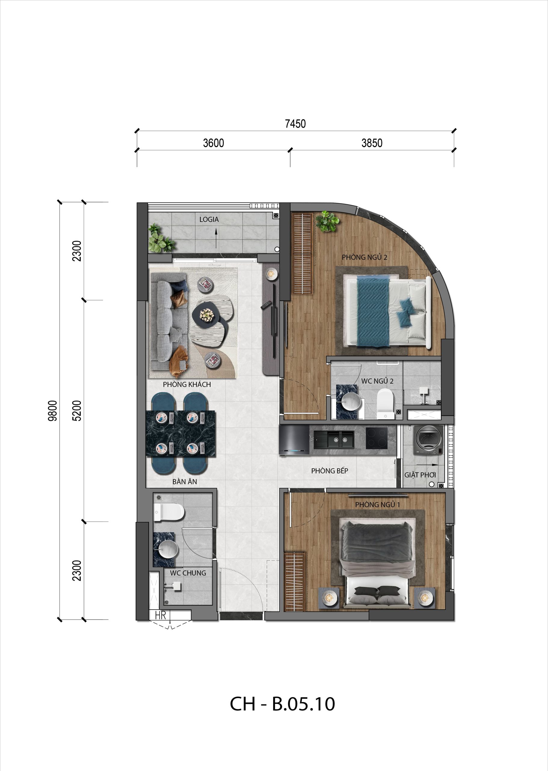 | Diện tích 2PN | 65m² (496 căn) |